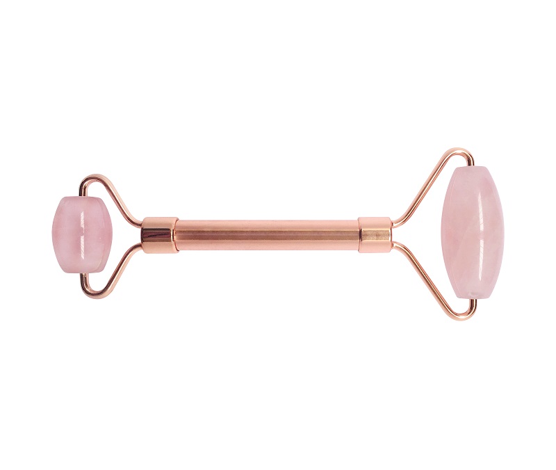 Rullo massaggiatore VISO composto da due pietre ovali di giada rosa, poste alle due estremità, una più grande, per guance, zigomi, mento e fronte, e una più piccola dedicata al contorno occhi e alla zona labbra.